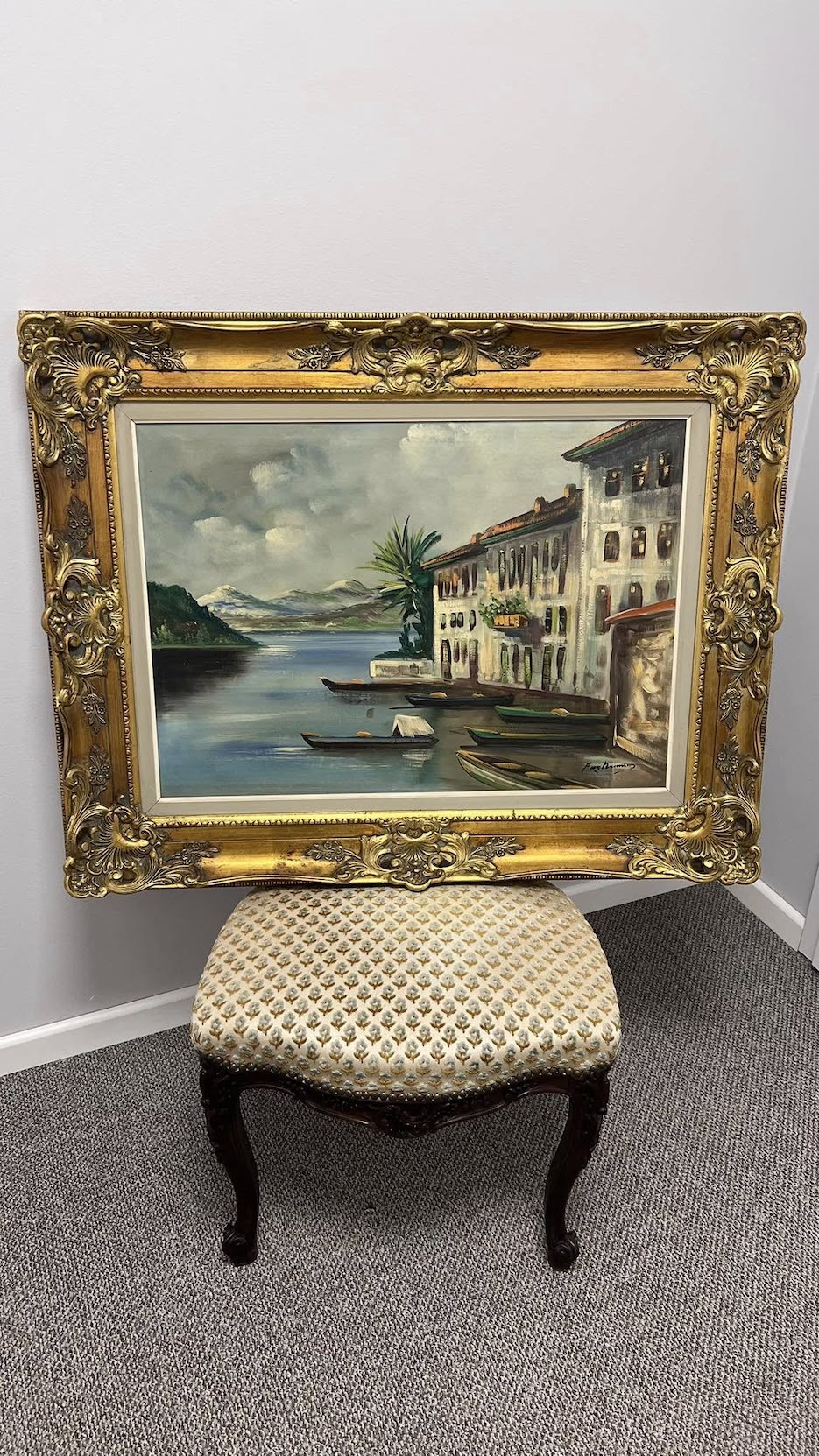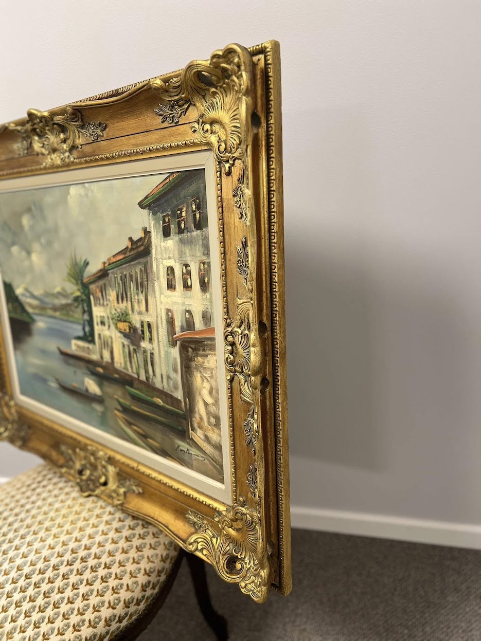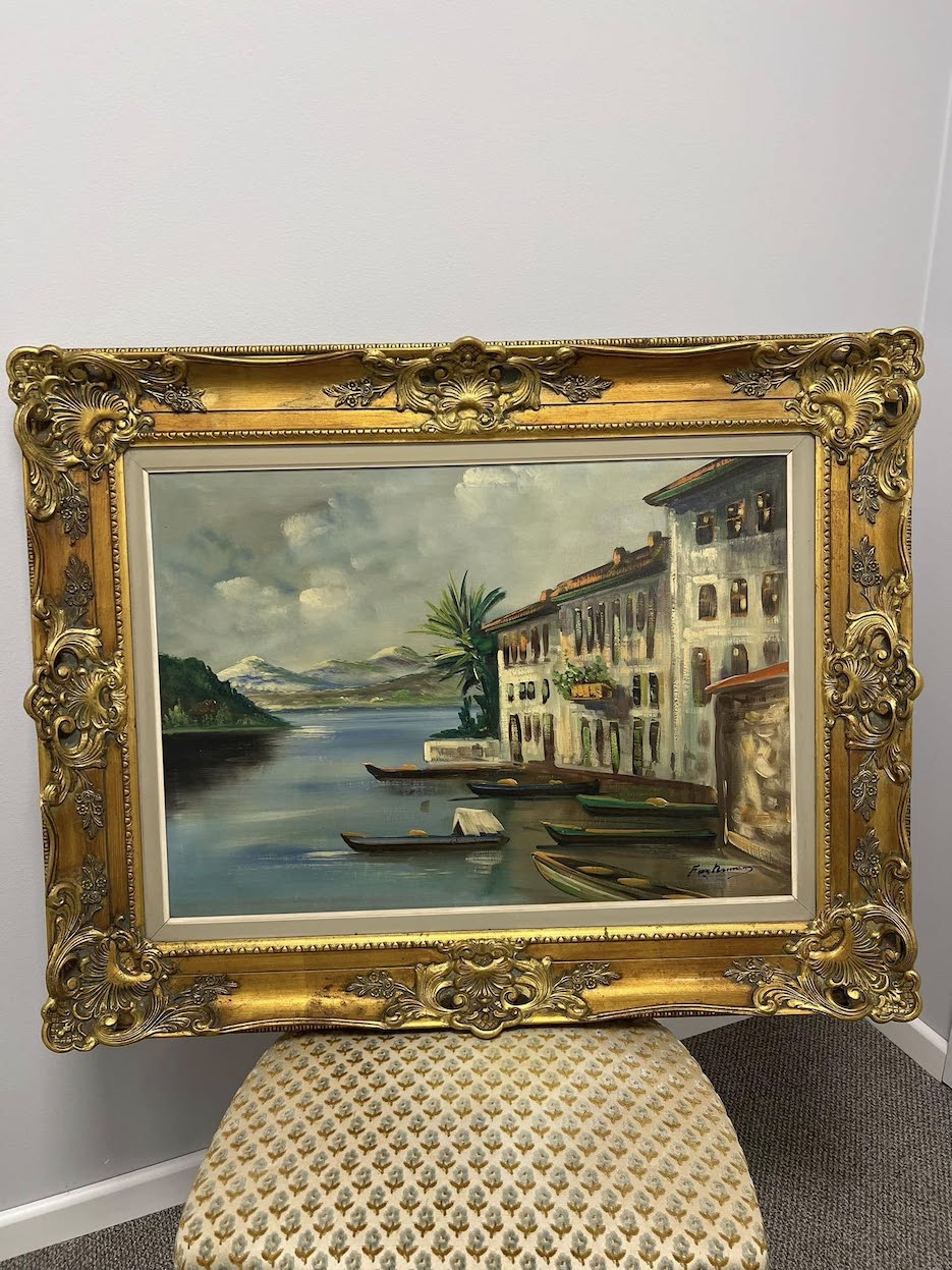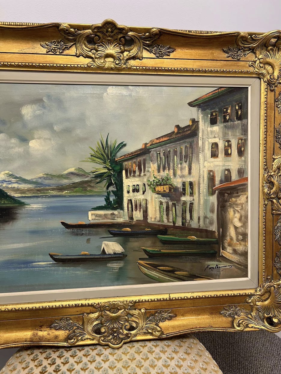 Aliejinė tapyba drobėje, vaizduojanti itališko ežero pakrantę – ramų, šviesos pripildytą miestelį su vandens atspindžiais, valtimi ir kalnų siluetais tolumoje.