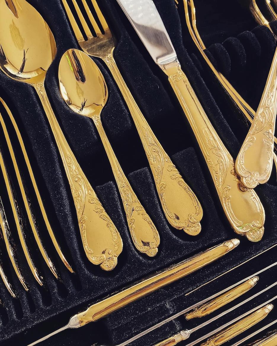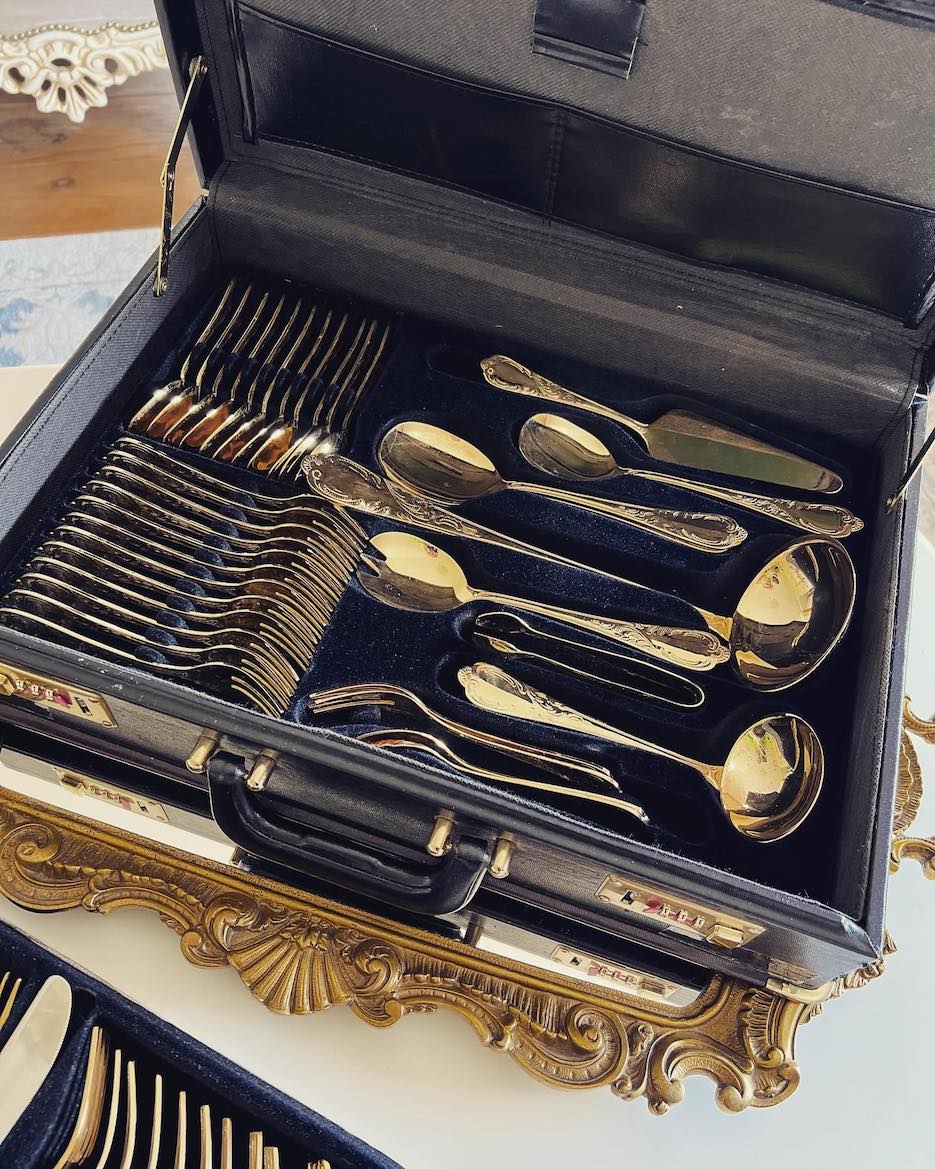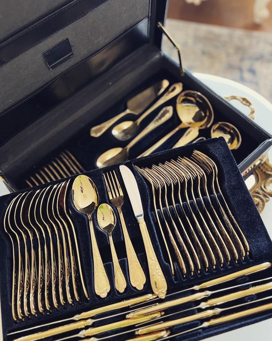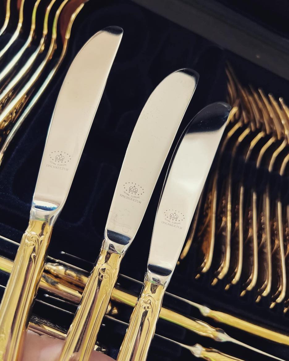 ♦ Vintažinis „Royal Europe Tischkultur“ komplektas su 24 karatų auksavimu. Aukštos kokybės nerūdijantis plienas (18/10), elegantiškas dėklas su rakinamomis spynomis.