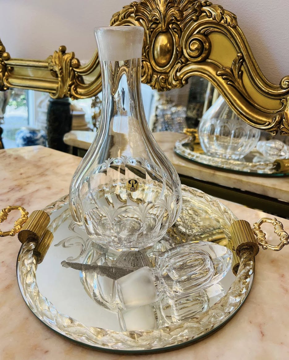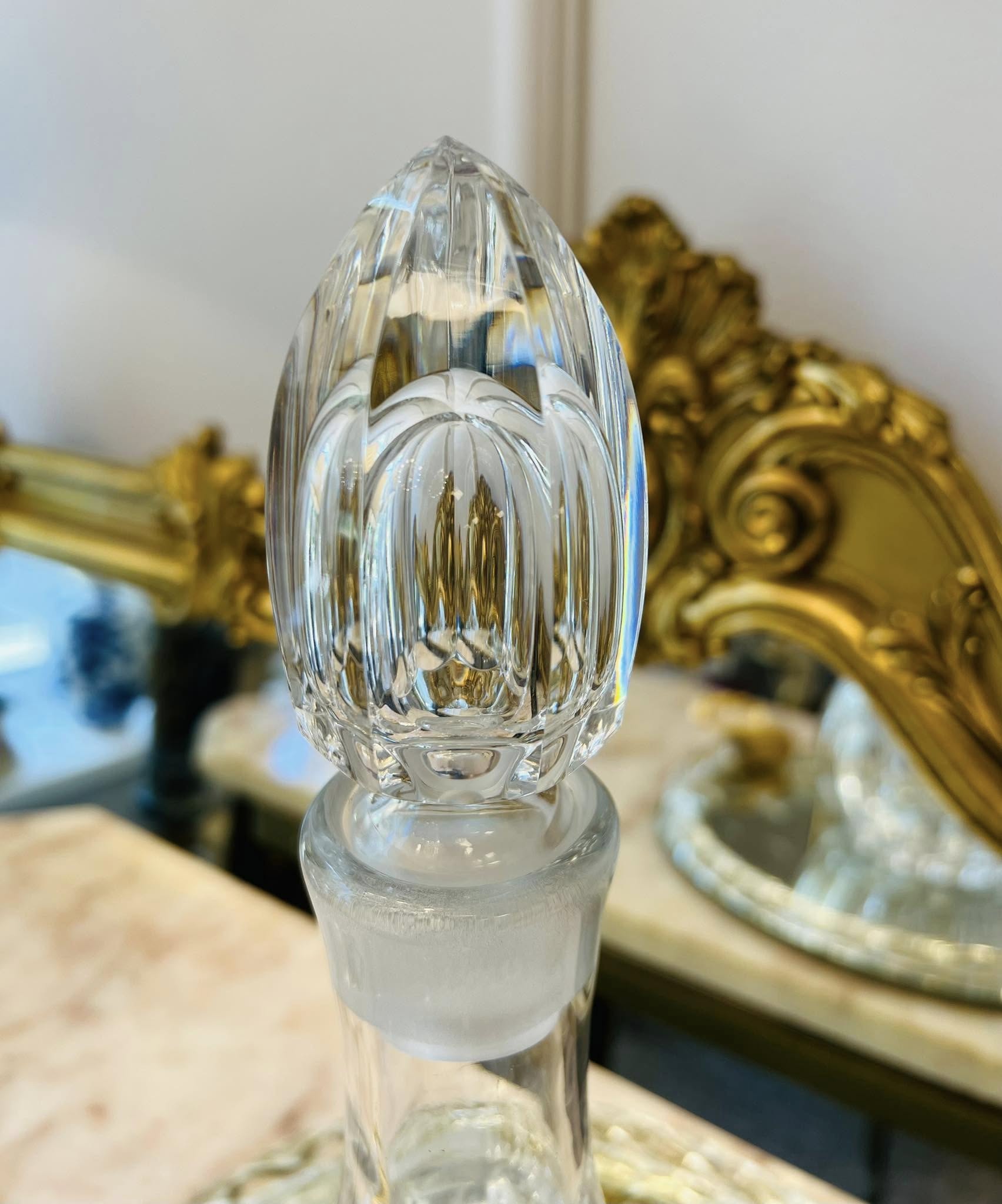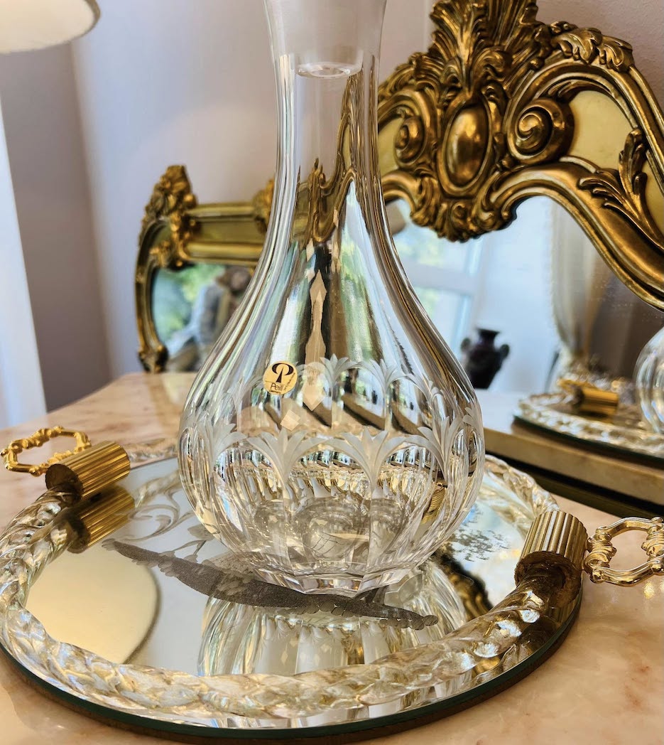 Išskirtinio grožio, rankomis šlifuoto krištolo grafinas, pagamintas žymaus Vokietijos gamintojo Peill dirbtuvėse. Švelniai banguotos formos korpusas dekoruotas preciziškai išraižytais augaliniais motyvais.