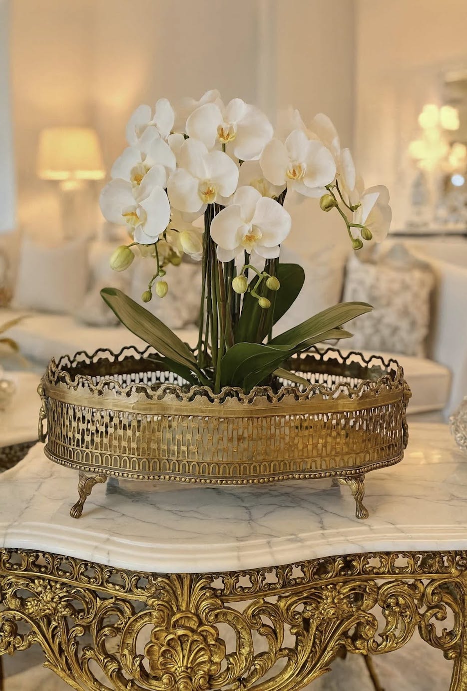 Labai dekoratyvus ir puošnus vazonas, pagamintas iš žalvario, su ažūriniu ornamentu ir bangelės formos viršumi. Stovi ant keturių stilizuotų kojyčių, kurios suteikia jam lengvumo.