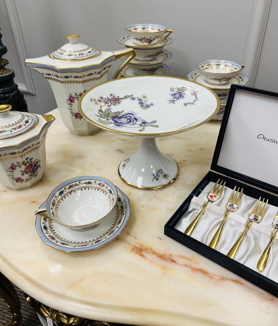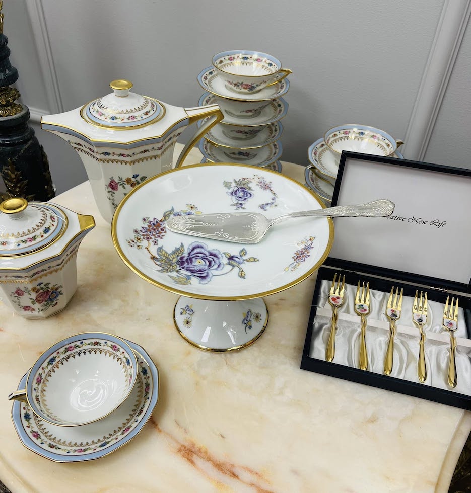 Antikvarinis plonyčio porceliano „Limoges Unique“ arbatos servizas (Prancūzija, 1929 m.)